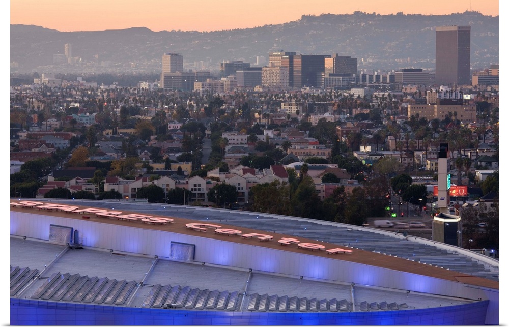 <p>USA, California, Los Angeles, Downtown, roof of Staple Center and Hollywood</p>