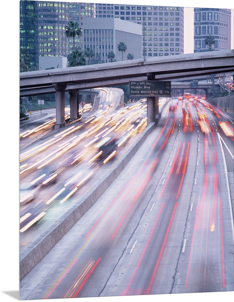 <p>Streaks of lights are photographed as traffic in Los Angeles moves quickly in either direction down the freeway.</p>