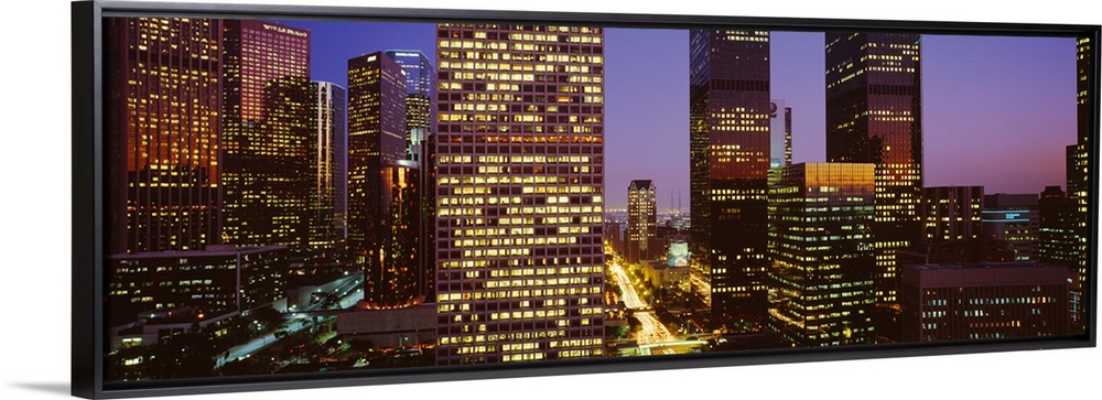 <p>Panoramic, close up photograph of lit skyscrapers at night, in Los Angeles, California, a vivid sky in the background.</p>