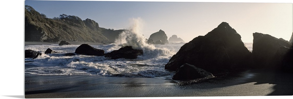 <p>Panoramic photograph of shoreline with huge boulders with ocean waves and spray.</p>