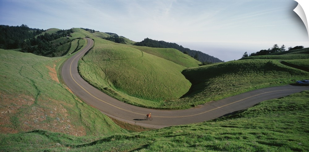 <p>Large, horizontal photograph of a winding road through the green landscape of Bolinas Ridge in Marin County, California. A lone person rides on a bicycle on the road.</p>
