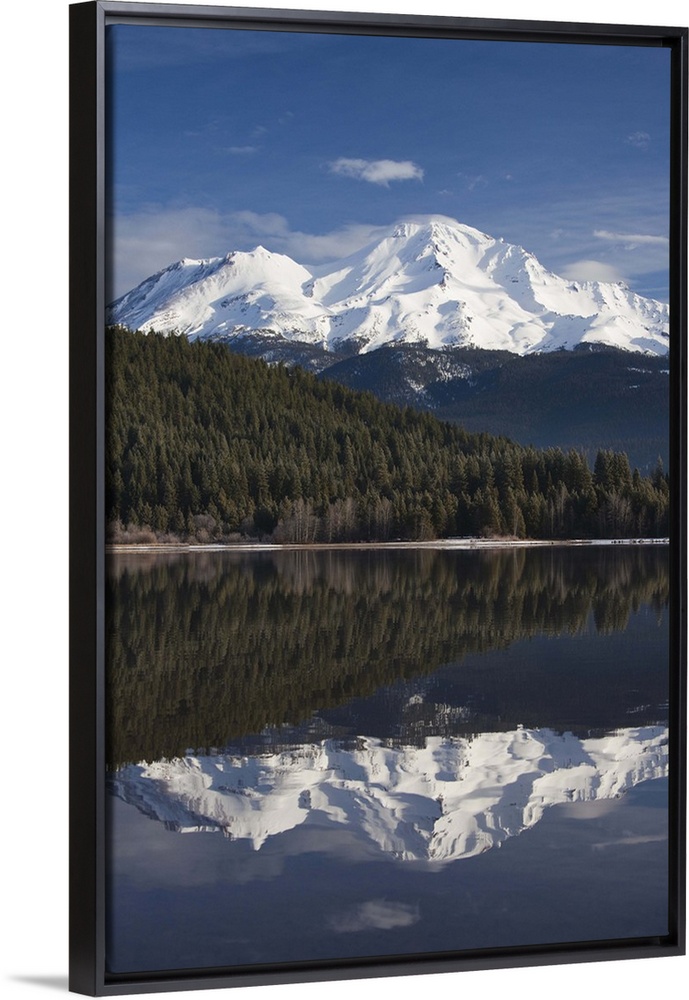 <p>USA, California, Northern California, Northern Mountains, Mount Shasta, view of Mt. Shasta, elevation 14,162 feet from Siskiyou Lake, morning, winter</p>