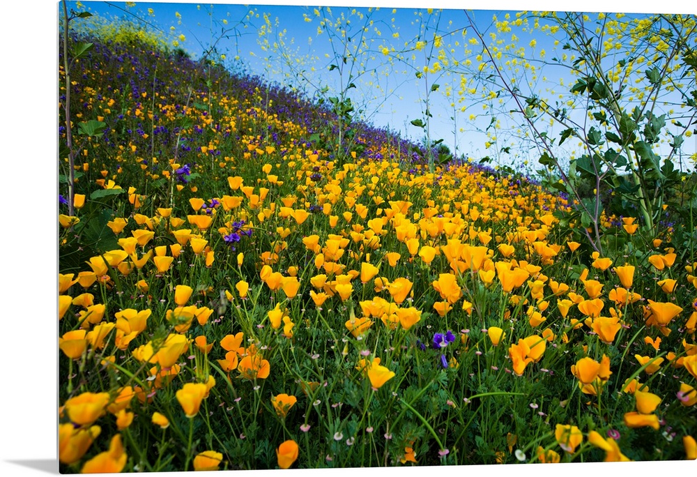 <p>California poppies (Eschscholzia californica) and Canterbury bells (Campanula medium) wildflowers growing in a field, Diamond Valley Lake, California, USA</p>