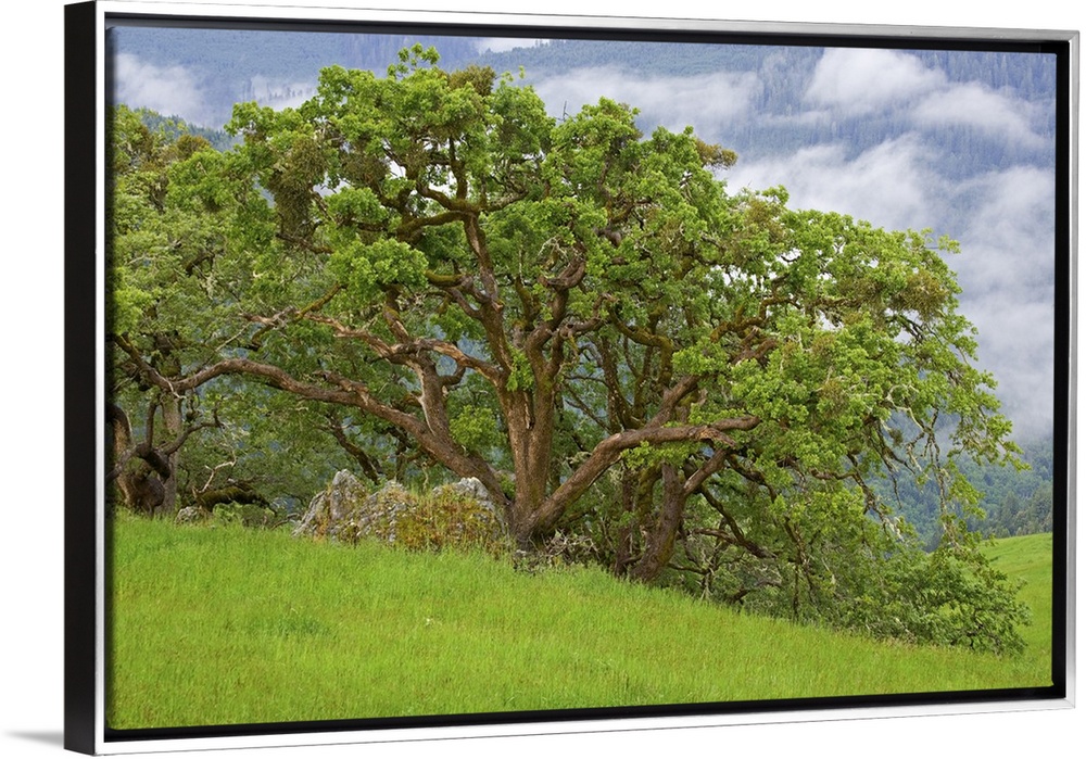 <p>USA, California, Redwood National Park. Large oak trees in mountain meadow.</p>