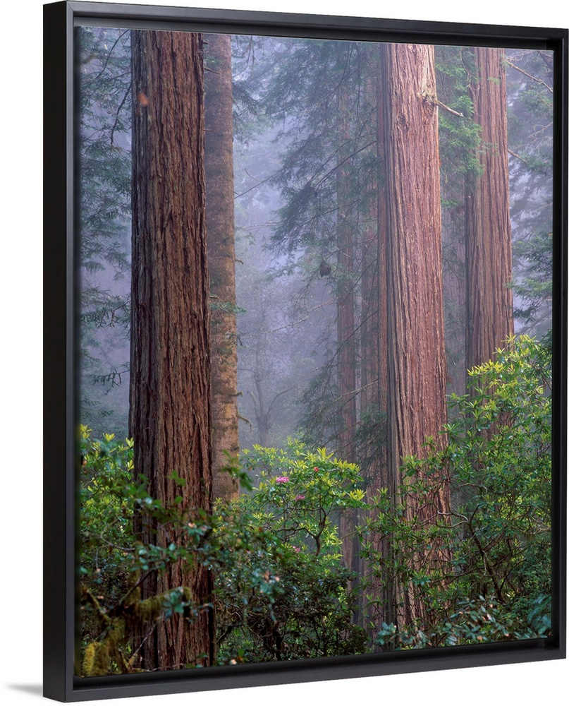 <p>United States, USA, California, Redwoods National Park, Rhododendrons growing among Giant Coastal Redwood trees in Lady Bird Johnson grove</p>
