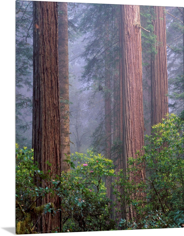 <p>United States, USA, California, Redwoods National Park, Rhododendrons growing among Giant Coastal Redwood trees in Lady Bird Johnson grove</p>