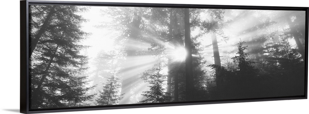 <p>Black-and-white panoramic photo of sunlight shining through the trees in the Redwood forest in California.</p>