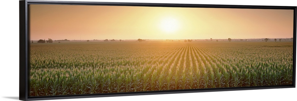 <p>A panoramic photograph of farmland filled with corn growing in straight rows.</p>