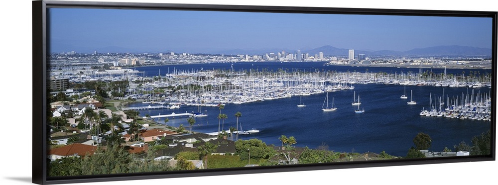 <p>A panoramic aerial view of the boats in the water of San Diego harbor.</p>