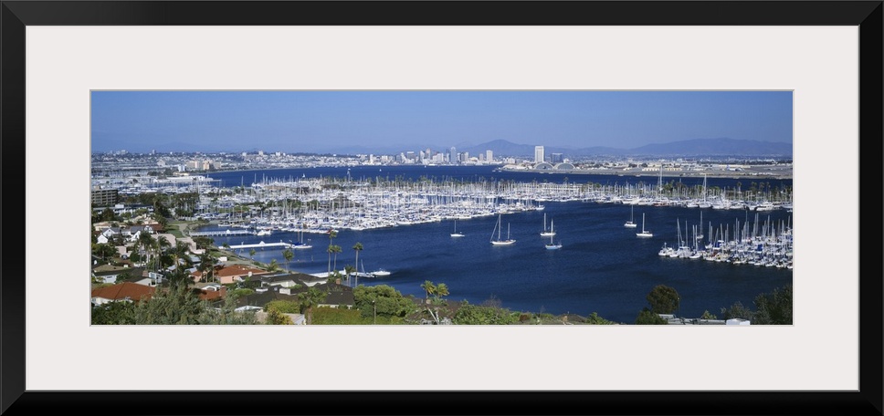 <p>A panoramic aerial view of the boats in the water of San Diego harbor.</p>