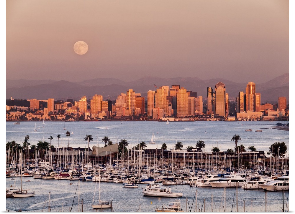 <p>USA, California, San Diego, Full moon rises over boats and city on San Diego Harbor</p>