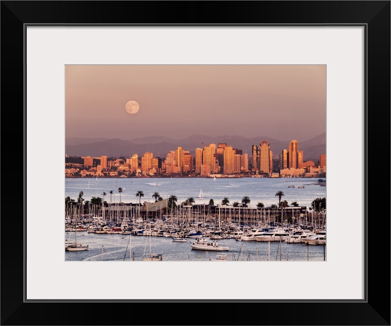 <p>USA, California, San Diego, Full moon rises over boats and city on San Diego Harbor</p>
