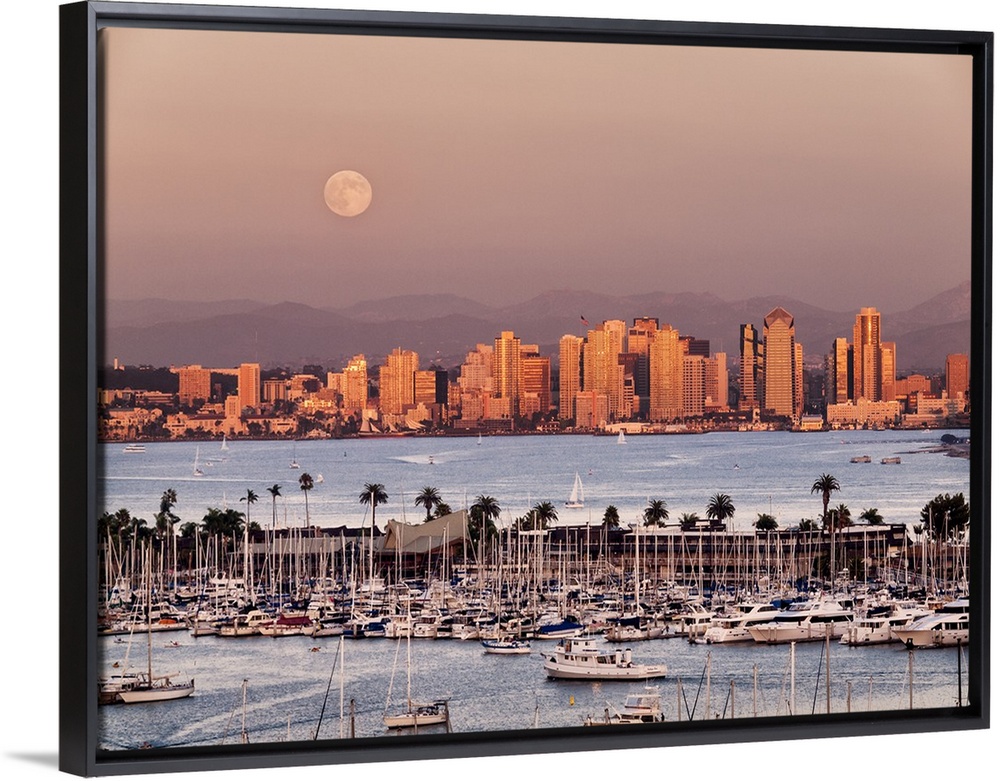 <p>USA, California, San Diego, Full moon rises over boats and city on San Diego Harbor</p>