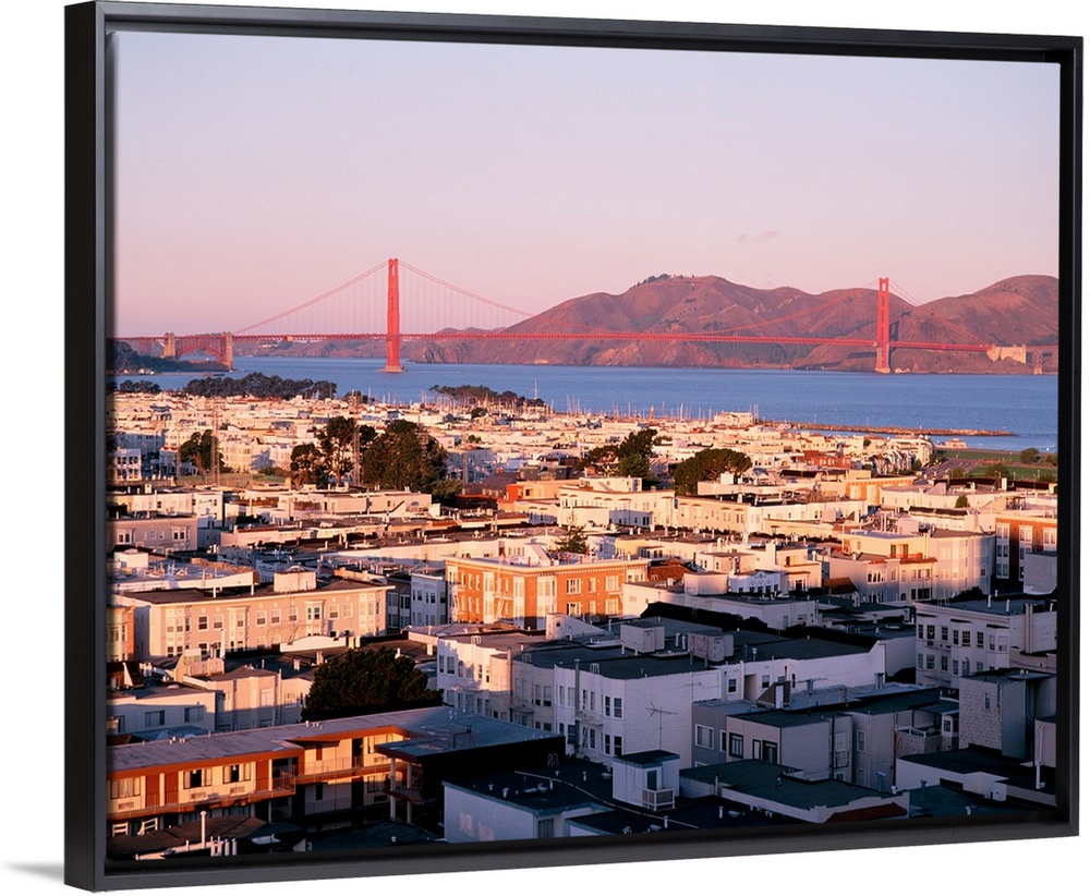 <p>This decorative wall art is a photograph of houses around the bay and the Golden Gate Bridge in the distant background.</p>