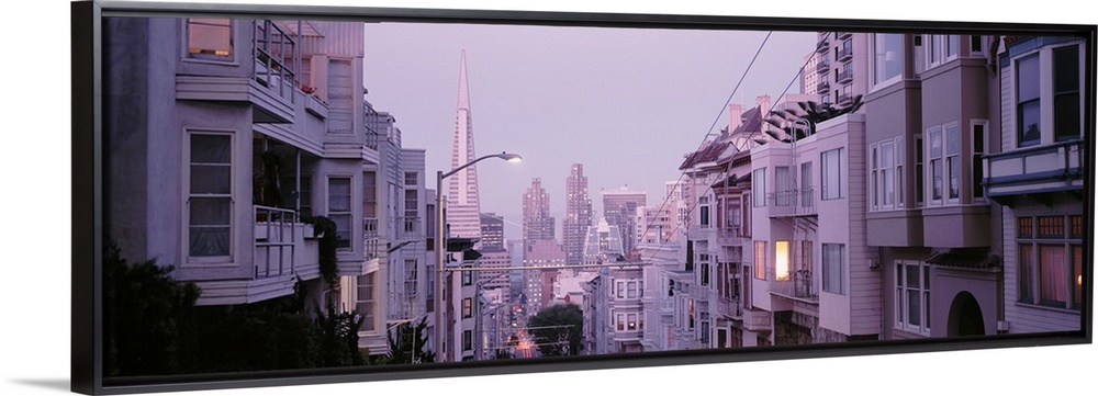 <p>Panoramic photo of apartment buildings in northern California looking down the street at the top of a hill.</p>
