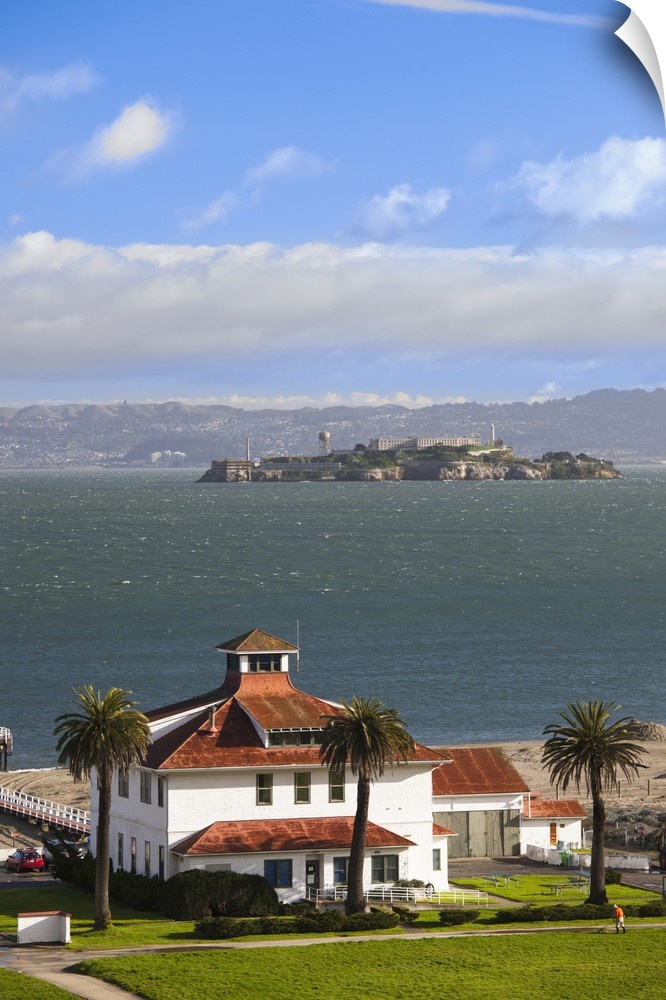 <p>USA, California, San Francisco, The Presidio, Golden Gate National Recreation Area, Crissy Field Park Visitor Center, elevated view with Alcatraz Island</p>
