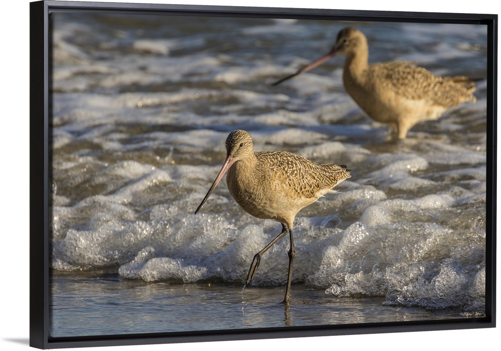 <p>USA, California, San Luis Obispo County. Marbled godwits feeding in surf. Credit: Cathy & Gordon Illg / Jaynes Gallery</p>