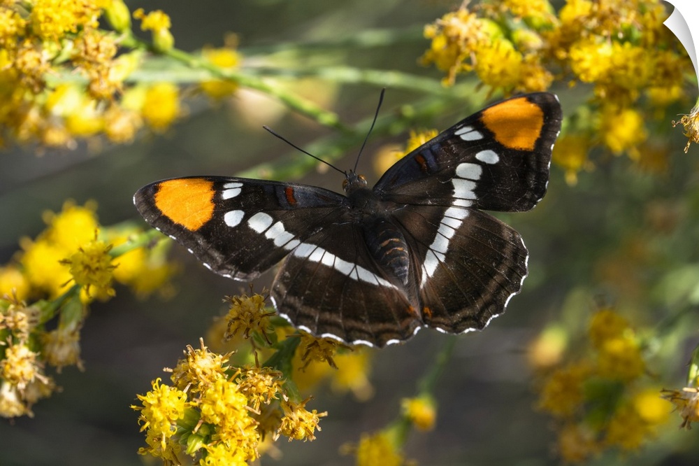 <p>Close-up portrait of a California Sister Butterfly (Adelpha californica) perched on bright yellow, flowering plant in the San Gabriel Mountains in Southern California, San Bernardino National Forest, California, United States of America</p>