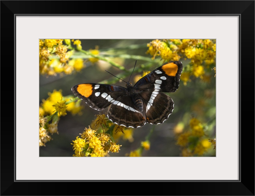 <p>Close-up portrait of a California Sister Butterfly (Adelpha californica) perched on bright yellow, flowering plant in the San Gabriel Mountains in Southern California, San Bernardino National Forest, California, United States of America</p>