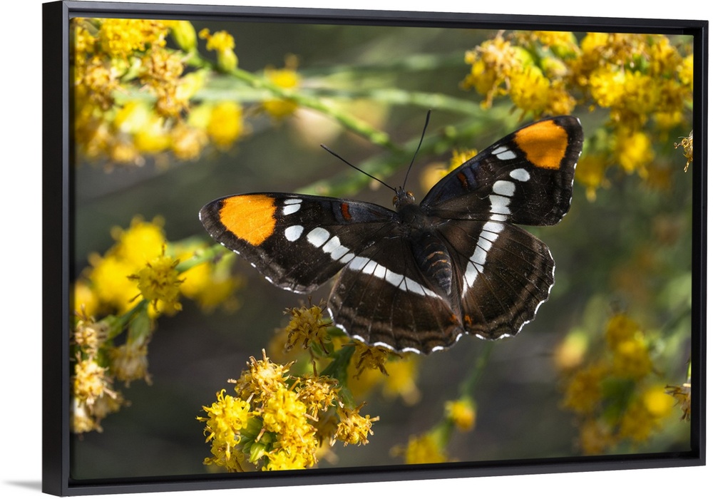 <p>Close-up portrait of a California Sister Butterfly (Adelpha californica) perched on bright yellow, flowering plant in the San Gabriel Mountains in Southern California, San Bernardino National Forest, California, United States of America</p>