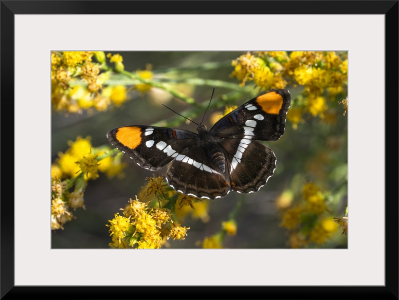 <p>Close-up portrait of a California Sister Butterfly (Adelpha californica) perched on bright yellow, flowering plant in the San Gabriel Mountains in Southern California, San Bernardino National Forest, California, United States of America</p>