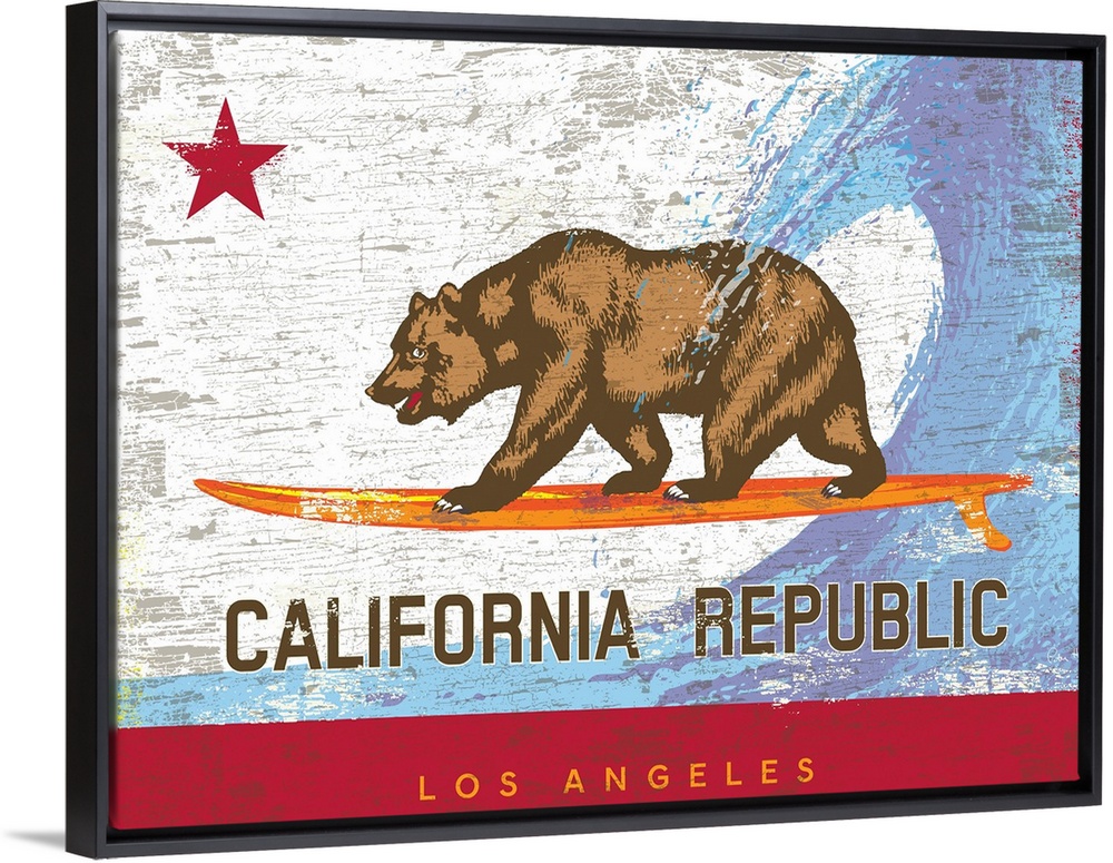 <p>Wall art of the California state bear flag with the bear surfing on a surfboard with wave behind and city name of Los Angeles at the bottom.</p>