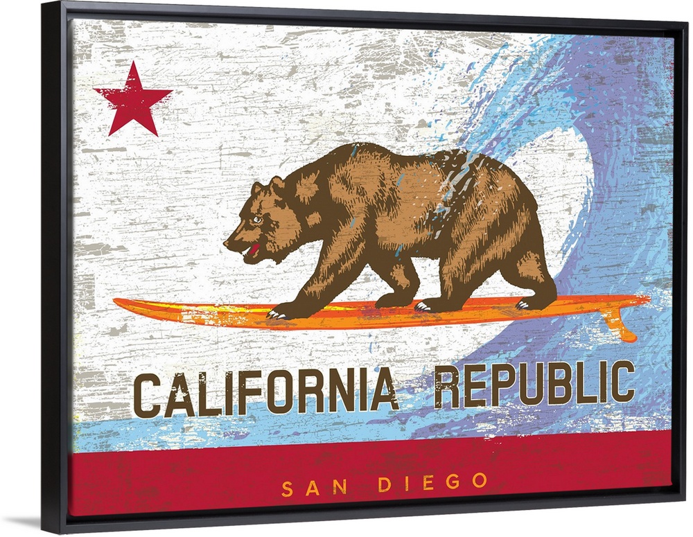 <p>Wall art of the California state bear flag with the bear surfing on a surfboard with wave behind and city name of San Diego at the bottom.</p>