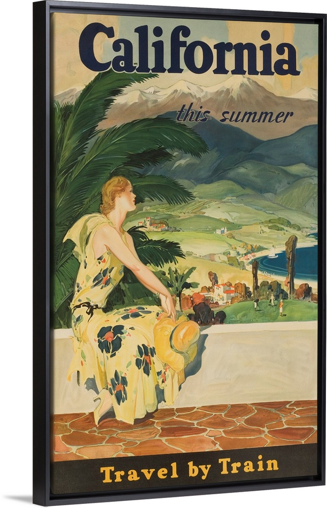 <p>ca 1930s Beauty sits on a wall overlooking Pacific Ocean and coastal town.</p>