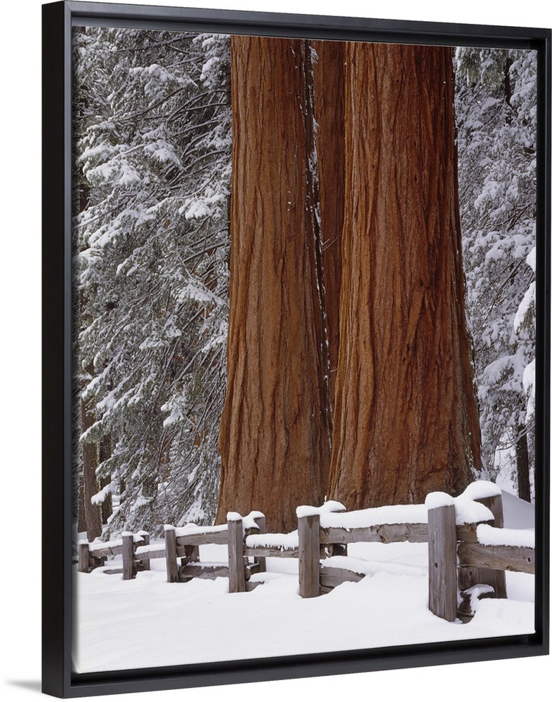 <p>USA, California, Winter, Three Sequoia Trees and Fence, Sequoia and Kings Canyon National Park.</p>