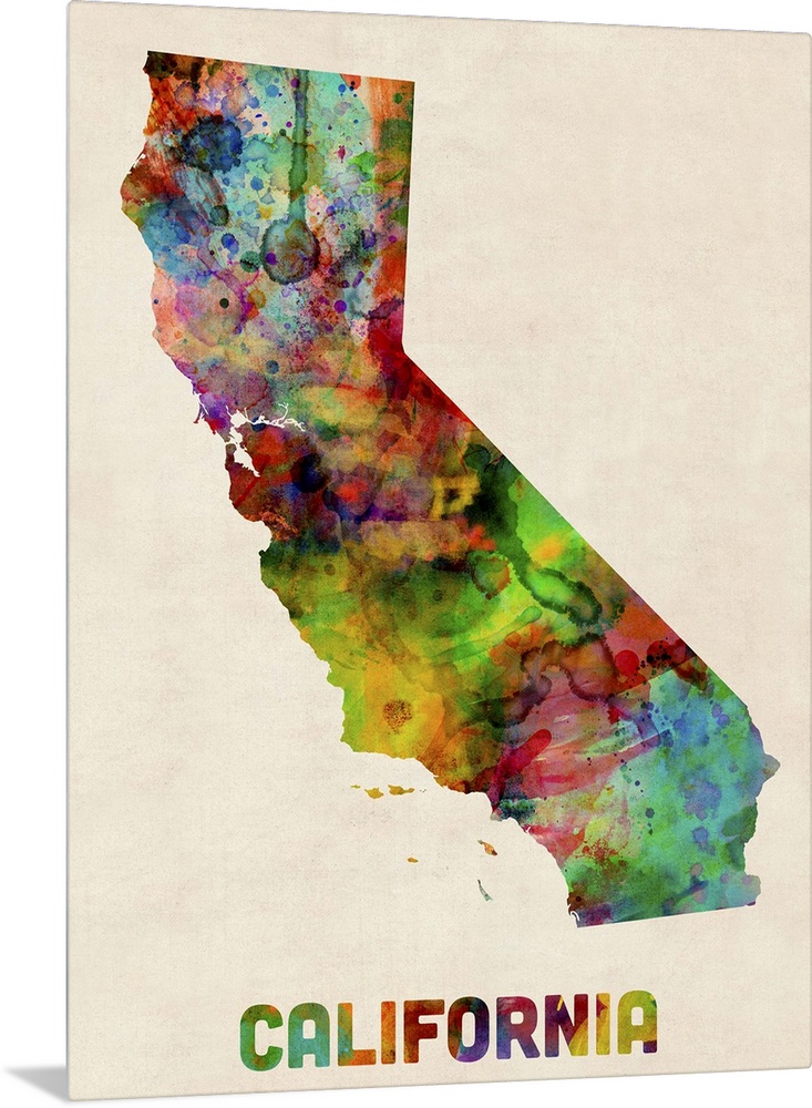 <p>Contemporary piece of artwork of a map of California made up of watercolor splashes.</p>