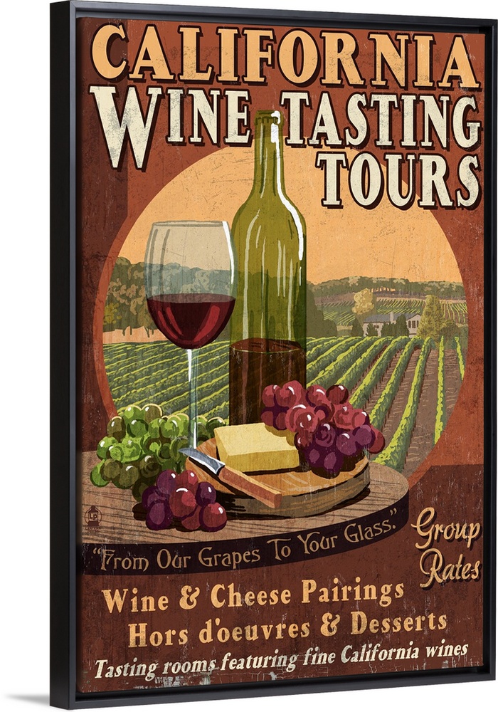 <p>A retro stylized art poster advertising vineyard tours with a bottle, glass of vine, grapes, and block of cheese.</p>