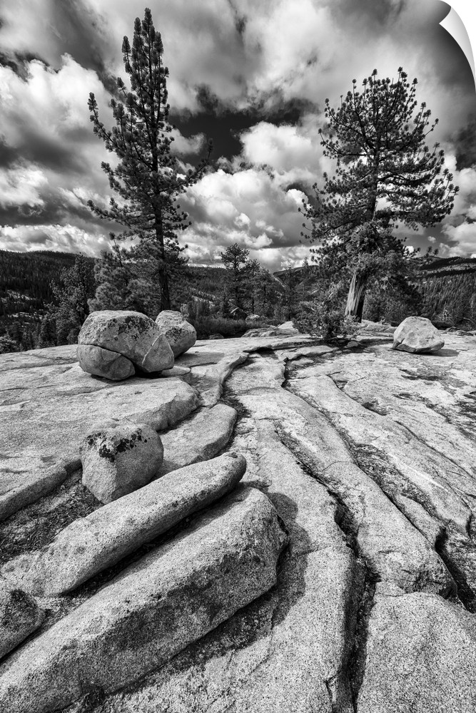 <p>North America, USA, California, Yosemite National Park. Black and White image of granite outcropping with boulders, clouds, and trees, Yosemite National Park, CA</p>
