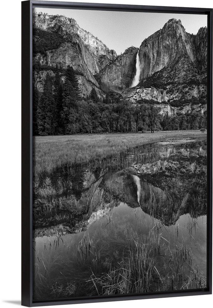 <p>North America, USA, California, Yosemite National Park. Black and White image of Upper Yosemite Falls with reflection in a pool, Yosemite National Park, CA</p>