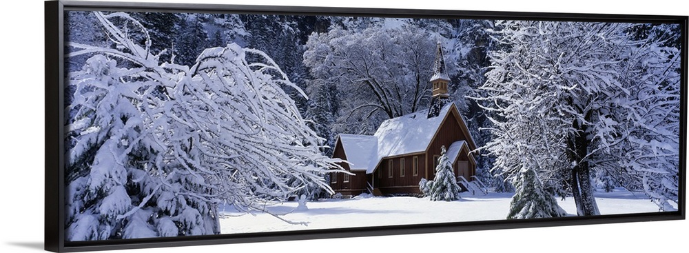 <p>Panoramic photo of a church in winter covered in snow at Yosemite National Park in California.</p>