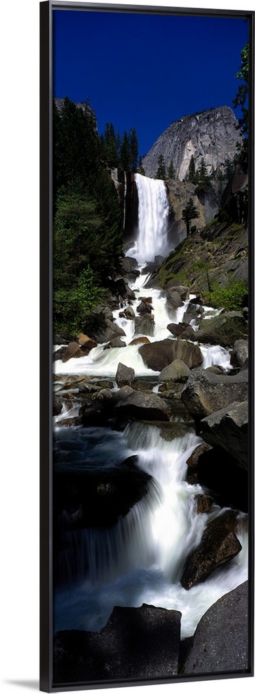<p>Vertical panoramic photograph of waterfall flowing into a rocky stream surrounded by trees.</p>