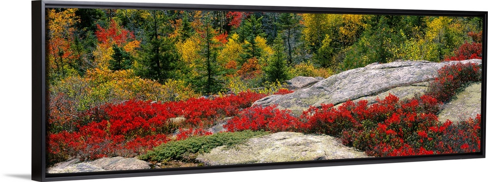 <p>Panoramic photograph shows a large rock face interspersed with brightly colored flowers between the cracks. The rock face leads into a forest thick with trees displaying their radiant Fall colors.</p>