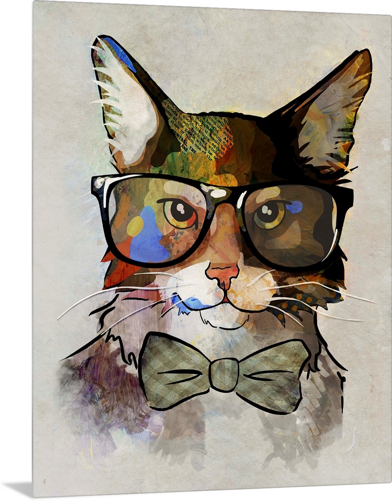 <p>Pop art of a cat wearing large glasses and a bow tie.</p>