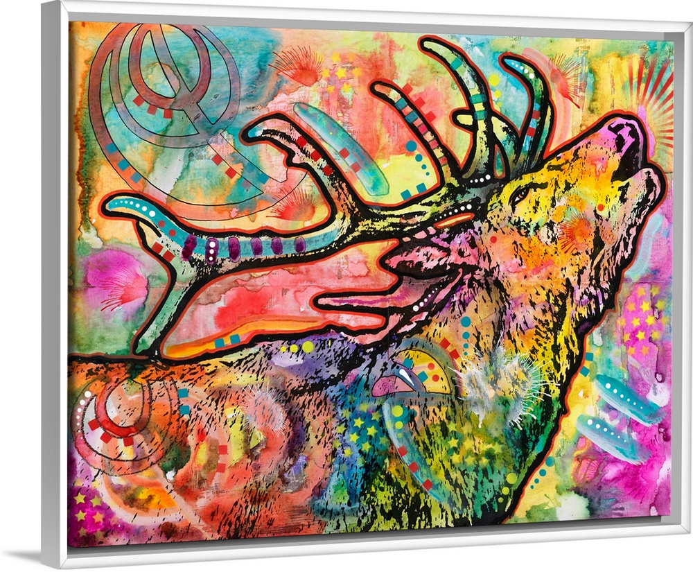 <p>Colorful painting of an elk with its chin up calling in the wind with abstract designs all over.</p>