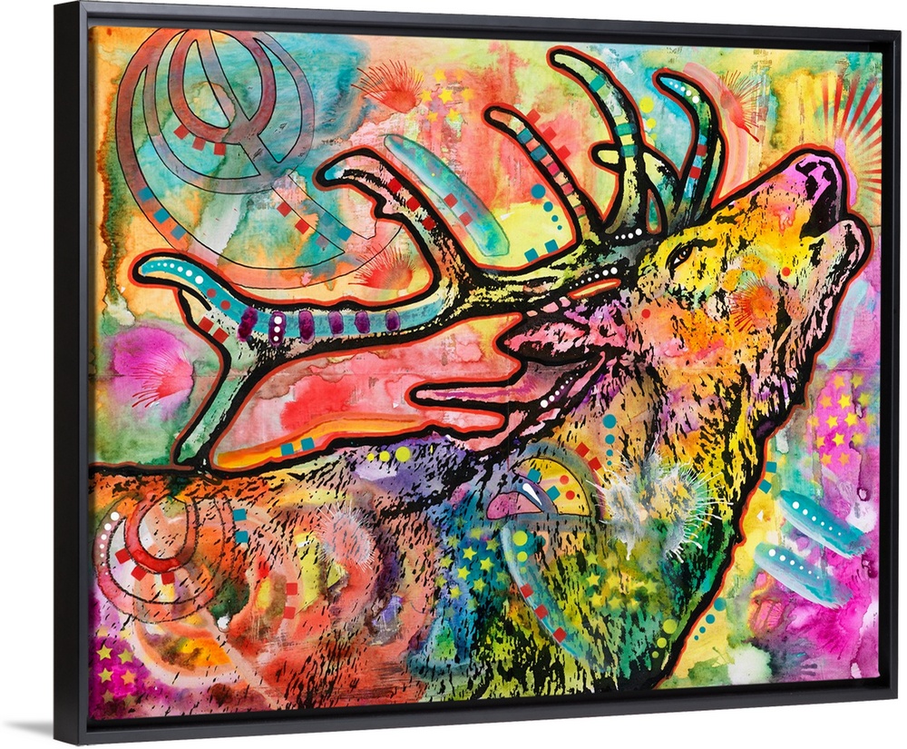 <p>Colorful painting of an elk with its chin up calling in the wind with abstract designs all over.</p>