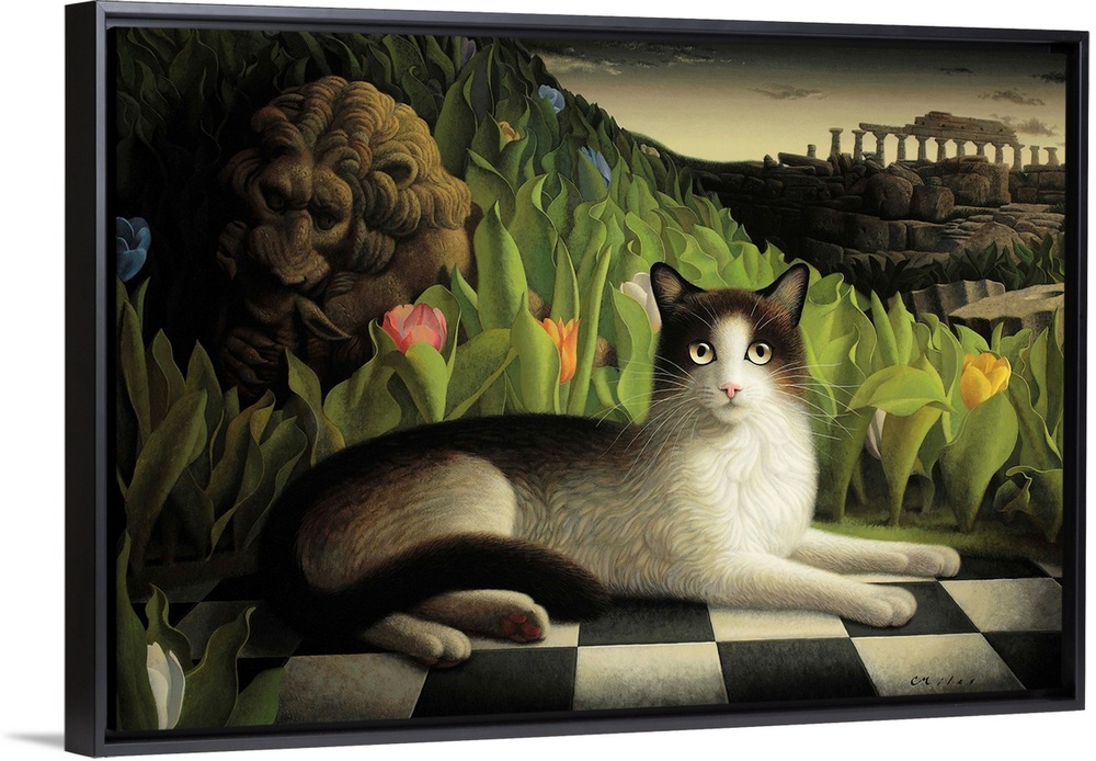 <p>Surrealist painting of a cat lying on a tiled floor with a landscape and decrepit columned structure in the background.</p>