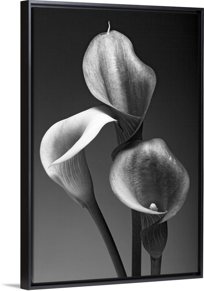 <p>Big monochromatic photograph shows a close-up of the tops of three flowers against a bare background.</p>