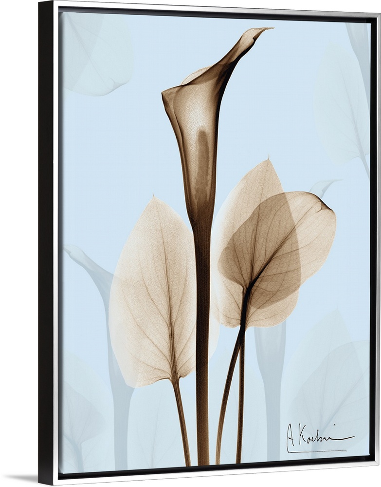 <p>Large, vertical x-ray photograph of a calla lily and several leaves, on a light background with the photographers signature at the bottom.</p>