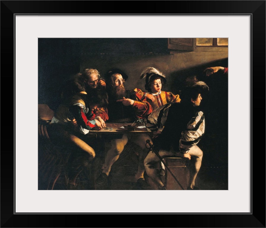 <p>The Calling of St Matthew, by Michelangelo Merisi known as Caravaggio, 1599 - 1600, 16th Century, oil on canvas, cm 322 x 340 - Italy, Lazio, Rome, San Luigi dei Francesi Church, Contarelli Chapel. Detail. St Matthew game table Jesus Christs hand money co</p>