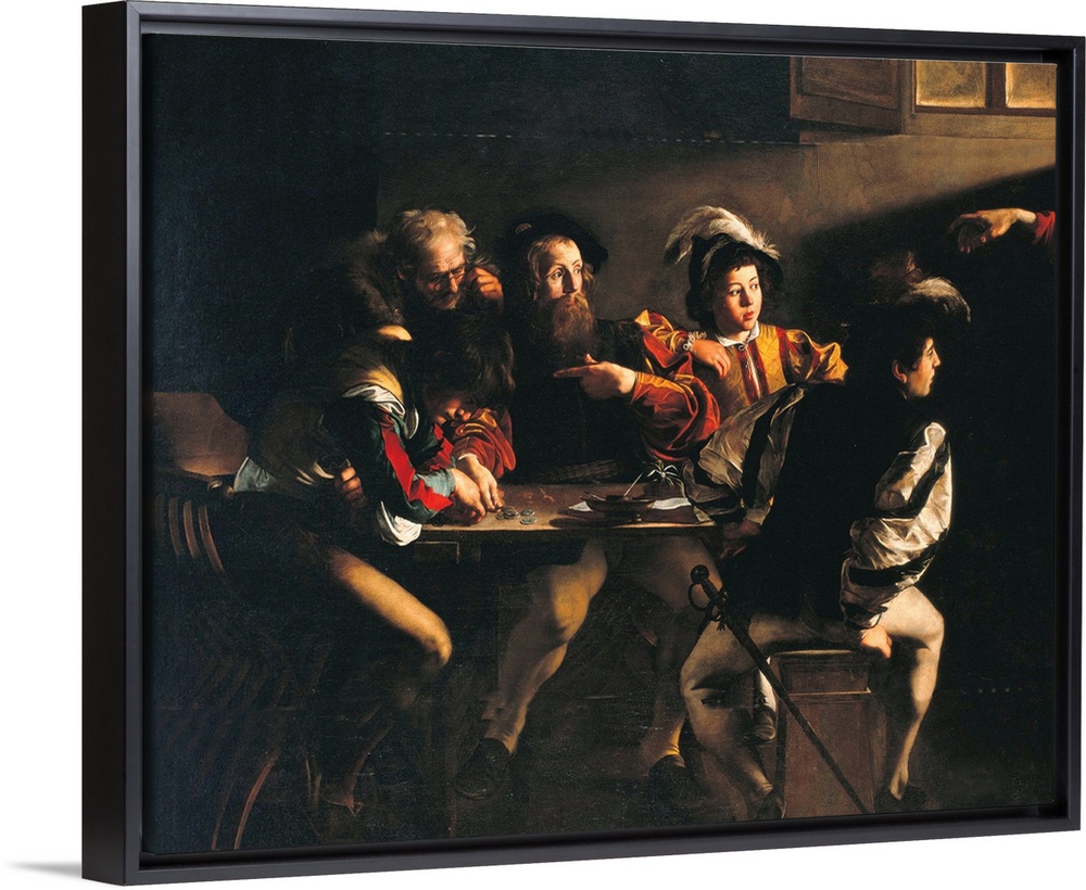 <p>The Calling of St Matthew, by Michelangelo Merisi known as Caravaggio, 1599 - 1600, 16th Century, oil on canvas, cm 322 x 340 - Italy, Lazio, Rome, San Luigi dei Francesi Church, Contarelli Chapel. Detail. St Matthew game table Jesus Christs hand money co</p>