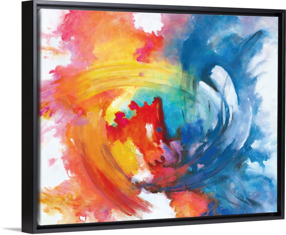 <p>Contemporary abstract painting in vivid rainbow colors, swirling in the center.</p>