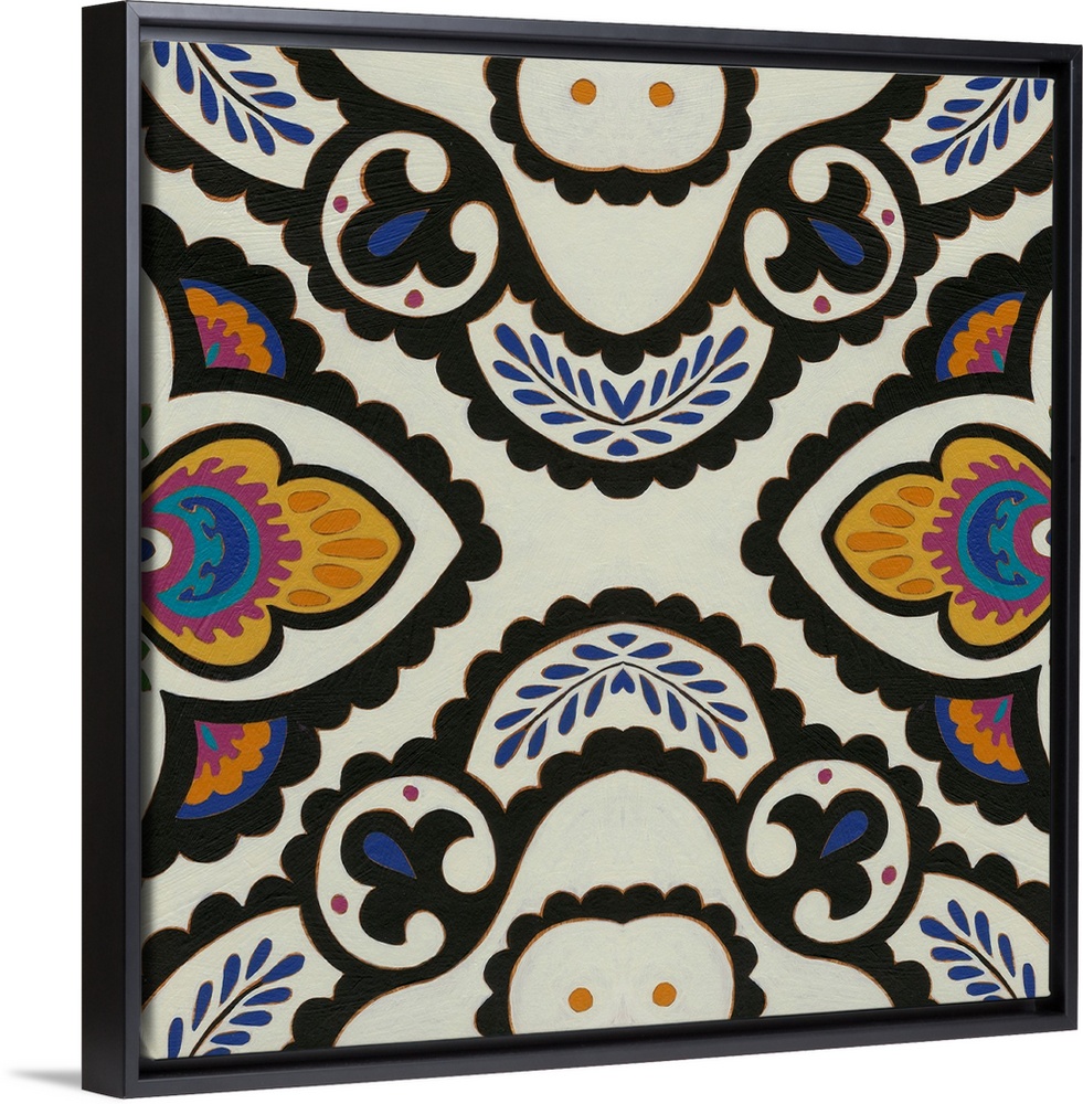 <p>Ornate floral pattern using dark and vibrant colors against a neutral background.</p>