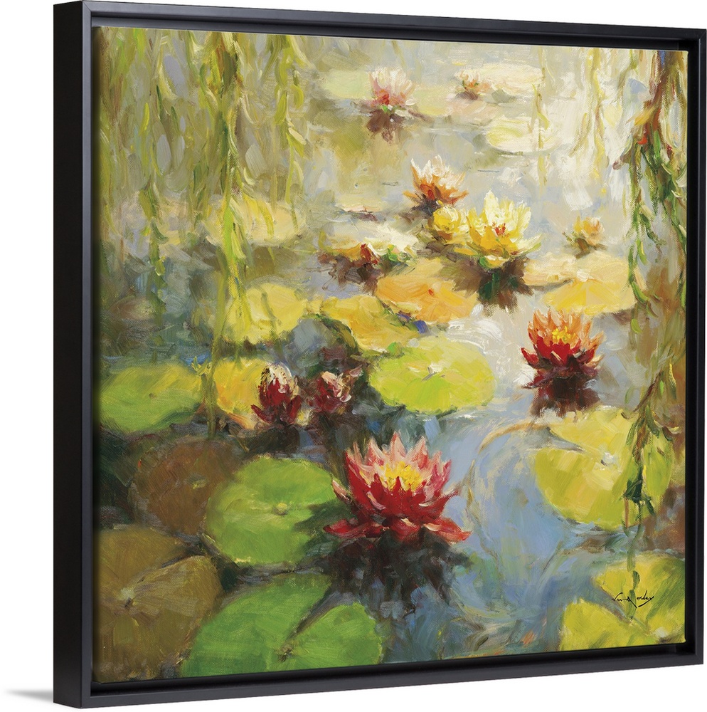 <p>Contemporary painting of several water lilies and lily pads floating in a pond.</p>