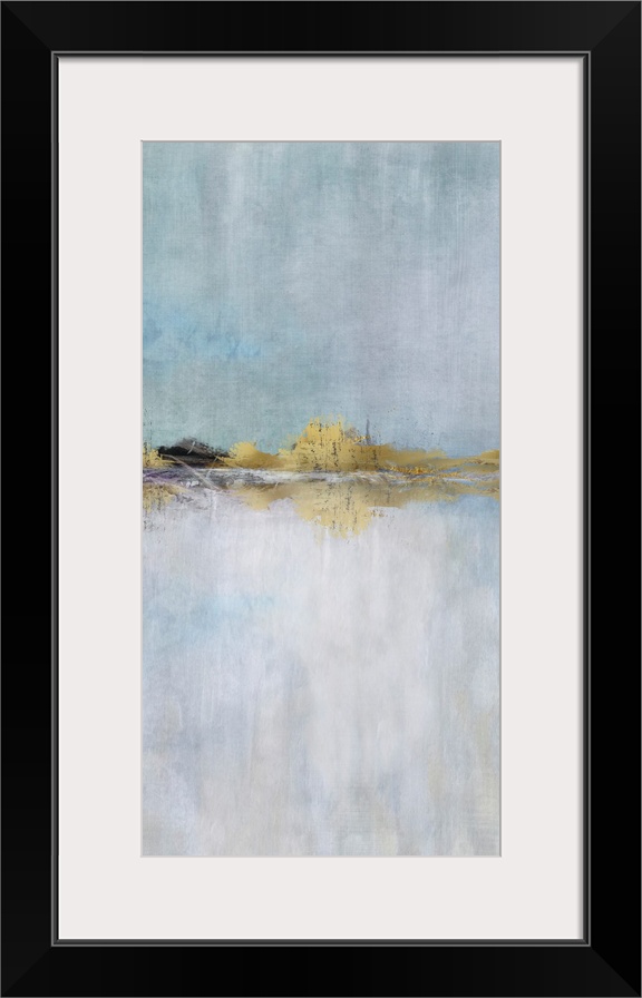 <p>Abstract painting with smooth blue and purple tones and a metallic gold horizon line.</p>