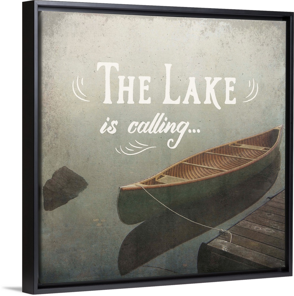 <p>"The Lake is Calling" written over an illustration of a docked canoe on the lake.</p>