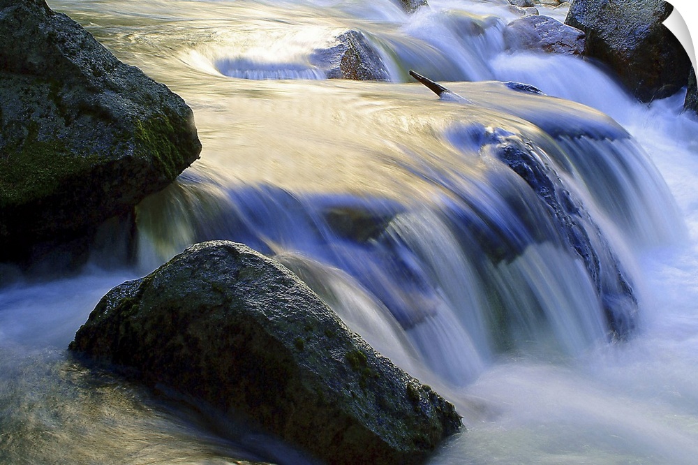 <p>Long exposure shot of water in a stream rushing over a rocky riverbed, creating a small waterfall.</p>